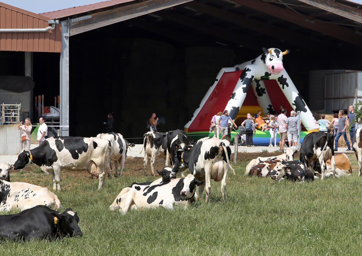 Tout au long de la journée, les petits et les grands ont pu participer à des activités dans 4 fermes différentes accessibles à pied : visite de la ferme pédagogique au GAEC des 4 Ponts, visite de la cave du Domaine Bohr à Gimbrett, découverte de la traite automatisée des vaches à l’EARL de l’Ancien Moulin Wack à Mittelschaeffolsheim, mais aussi structure gonflable pour les enfants et rencontre avec les vaches.